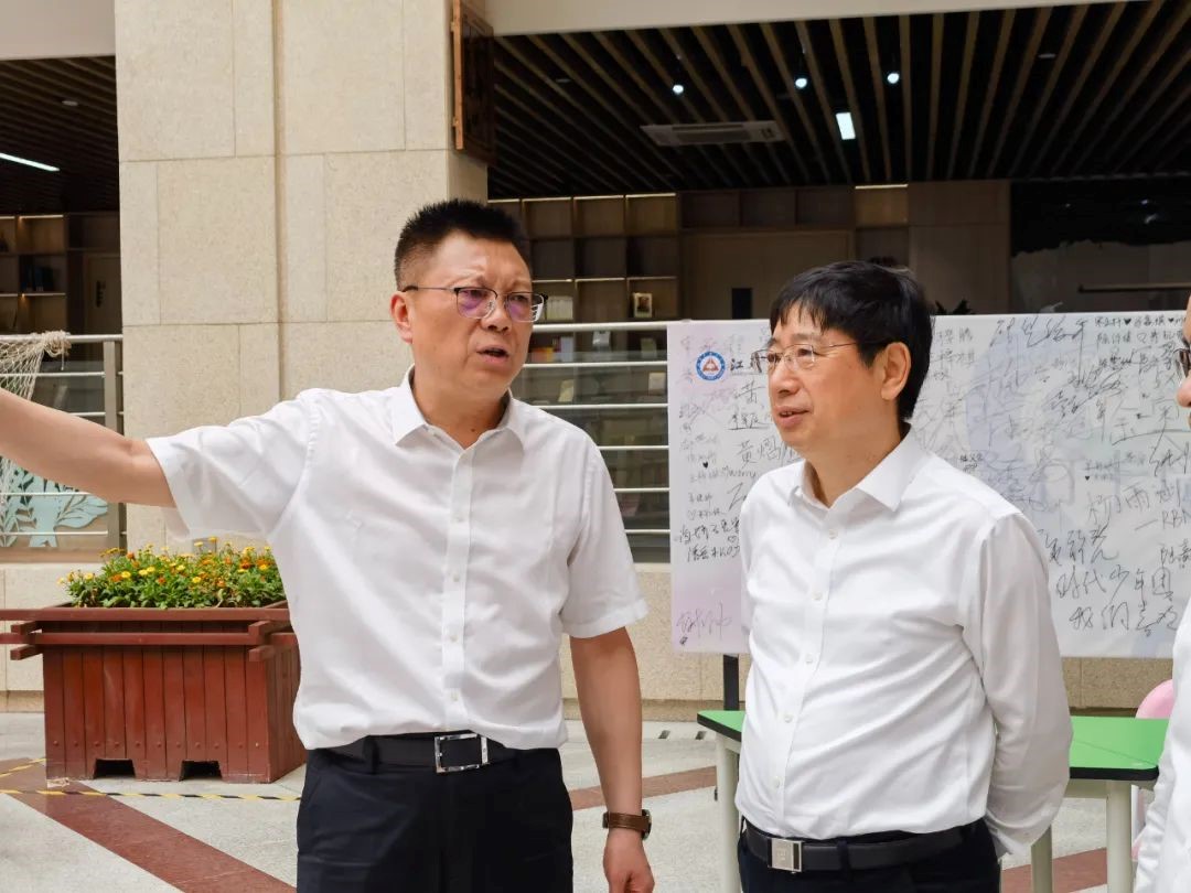 吴广明一行参观了海门中学校园和校史馆。海门中学党委书记、校长高迎九介绍了海门中学的历史沿革和办学理念,并陪同参观了海门中学弘謇楼“一馆两基地十中心”等特色办学场所。