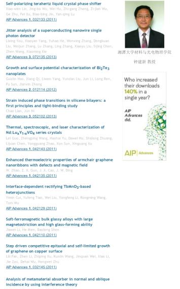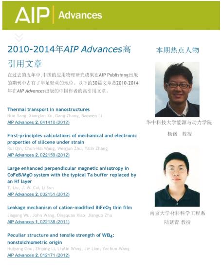 在过去的五年中,中国的应用物理研究成果在AIP Publishing出版的期刊中占有了举足轻重的地位。在2010-2014年中国作者在AIP Advances出版的30篇高引用文章中,太阳城集团官方网站声子学与热能科学中心徐象繁研究员等共同发表的“Thermal transport in nanostructures” 位居前列。