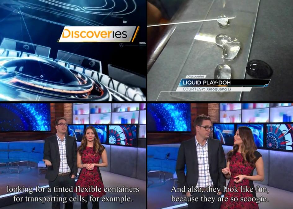 of droplets with interfacial nanoparticle jamming, Soft Matter, 2016, 12, 1655”, 被选为该杂志第12卷第6期的封面,并引起了著名学术评论媒体的关注,先后被《New Scientist》杂志和Discovery频道报导。