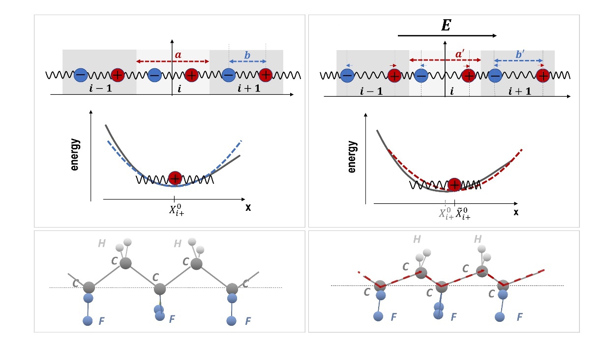 传统的声子理论在解释晶体热导率时通常是将原子的非简谐振动当作微扰处理,然而当体系受到外加电场、磁场、应力或高温等强干扰因素影响时,原子将明显偏离原本的平衡位置,从而诱发声子谱的非谐性改变。在这种情况下微扰理论不再适用。这种声子谱的非谐性改变已突破传统的声子理论,近年来已有一些研究开始尝试利用“声子重整化”对热输运进行进一步的诠释。铁电高分子聚合物P(VDF-TrFE),具有自发极化方向,受外加电场方向的影响,碳氟键和碳氢键与主链之间的键角将发生明显的改变(如图1所示),我们猜想这一行为也许能引起声子的重整化过程。