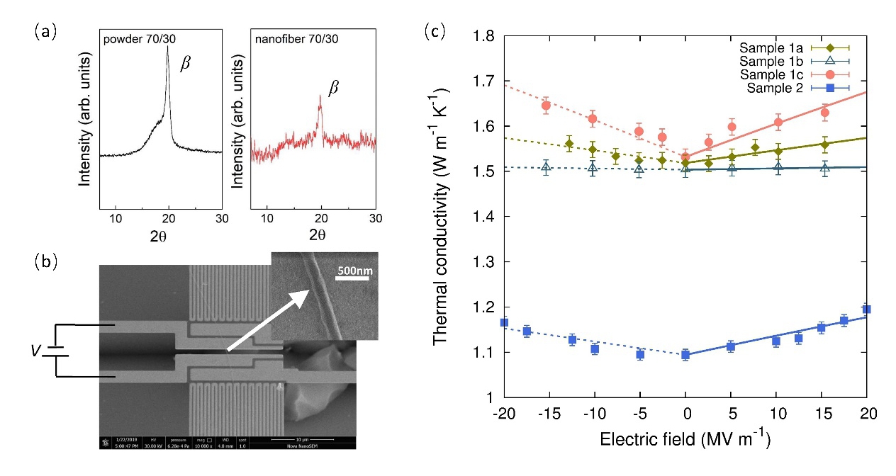 2. aP(VDF-TrFE)粉末与P(VDF-TrFE)纳米纤维的XRD测试结果;(b)单根P(VDF-TrFE)纳米纤维悬空在MEMS测试器件之上,最靠近中间的两根电极用于施加外加极化电场;(cP(VDF-TrFE)纳米纤维的热导率随外加极化电场的变化情况。