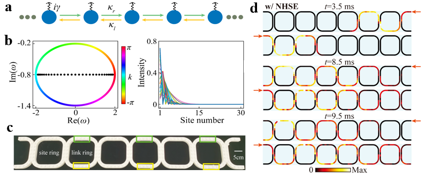 图1 a引入背景损耗的Hatano-Nelson模型,b数值计算的本征频率和本征模态分布,c构造的只含有损耗调制的一维声学环形腔系统,d暂态非厄米趋肤效应随时间的演化过程