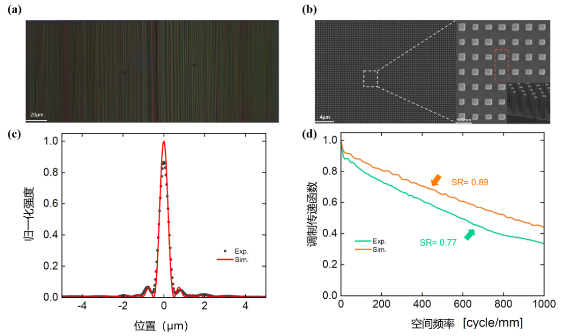该团队也对设计的超透镜进行了微纳制造和表征,实验超构透镜的特雷尔比为0.77,这甚至比仅位相型超构透镜仿真的特雷尔比还要高0.07,这证明仅实现所需振幅的趋势和位相要求就足以显著提高大数值孔径超构透镜的调制传递函数。