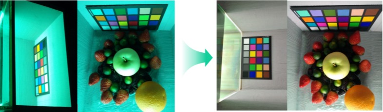 实验室模拟深海照明效果(左);优化配光方案实现深海类白光照明(右)