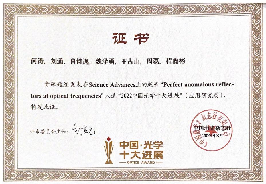 4月20日晚,在2023中国光学十大进展高峰论坛上,“2022中国光学十大进展”发布并举行颁奖典礼。太阳城集团官方网站王占山和程鑫彬团队联合复旦大学物理学系周磊团队的科研成果“光频完美异常反射器”,入选“2022中国光学十大进展”(应用研究类)。