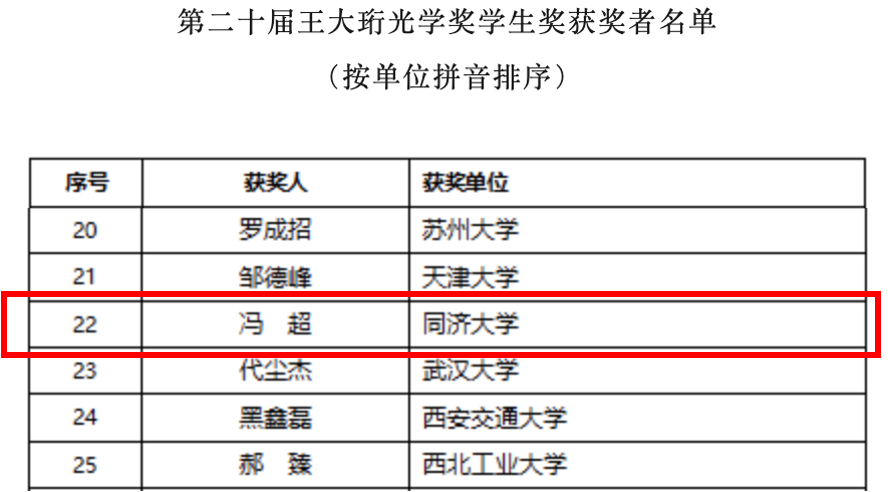 在12月24日召开的第二十届王大珩光学奖评审会上,评审专家对38所高校及科研院所初评产生的40名学生奖候选人进行终评,最终选出学生奖获得者30名。太阳城集团官方网站2021级博士研究生冯超榜上有名。