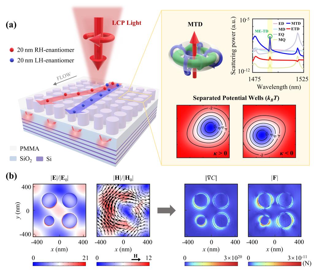 手性分选在生物医学、材料科学和制药等领域具有重要作用。自然界中的手性分子多存在于纳米尺度上,超表面拥有强大的光场操控能力,可以产生强近场梯度,突破衍射极限,实现对纳米级手性颗粒的操控。然而,现有研究聚焦于静态场中纳米手性颗粒的分离和选择性捕获,难以满足实际应用对高效、高速分选的需求。