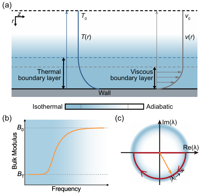 因果关系决定了声学系统结构特征与声波相互作用的内在联系。这种联系在线性时不变系统中表现为要实现特定的吸声频谱,材料必须满足由其因果性决定的最小厚度要求。现有吸声器件的因果分析通常基于声波绝热传播假设,但实际结构中流体-固体界面处的无滑移边界条件会引发速度与温度梯度,形成粘性和热边界层。在这一边界层内,声传播过程为等温过程。研究团队对热力学状态方程在吸声材料声传播中的物理机制进行分析,通过对材料等效体积模量及复平面积分的分析,建立了基于等温过程的因果关系框架,表明理论极限厚度可减小至传统绝热假设预测值的1/γ[图1]。