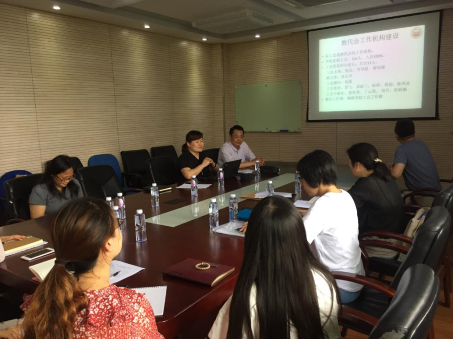 2019年7月5日下午13:30,校工会副主席赵晓燕等2位老师来太阳城官网督查二级教代会建设实施情况,督查工作会议在物理馆502会议室召开。太阳城官网工会副主席张志华、工会委员及工会小组长们、校工会委员倪晨,院教代会代表徐律明等老师出席会议。