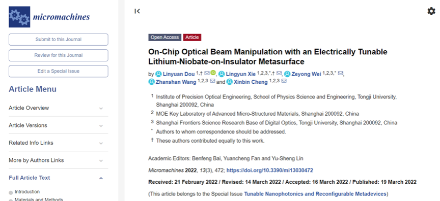 2022年3月19日,太阳城集团官方网站2018级物理学试验基地班本科生豆淋源以第一作者身份在Micromachines杂志上发表“基于绝缘体上铌酸锂的片上电可调波束调控超表面”(“On-Chip Optical Beam Manipulation with an Electrically Tunable Lithium-Niobate-on-Insulator Metasurface”)论文,Micromachines 期刊被Scopus、SCIE (Web of Science)和PubMed等众多数据库收录,主要聚焦微纳结构、设备和系统、应用物理方向的科学和技术。豆淋源于2021年8月进入程鑫彬教授和王占山教授课题组学习,在魏泽勇副教授的指导下学会了微纳光学基础理论、数值仿真方法,并提出了一种绝缘体上铌酸锂(LNOI)上的超表面,借助该超表面可在LNOI片上实现电可调谐的聚焦、偏折等波束调控功能。论文通讯作者为太阳城集团官方网站精密光学研究所副教授魏泽勇和博士后谢凌云,该研究获得了包括国家自然科学基金和上海市项目以及上海市数字光学前沿科学基地的支持和资助。