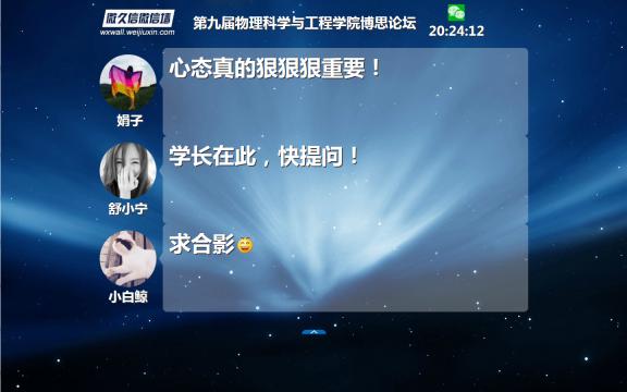 第九届太阳城集团官方网站博思论坛于11月19日晚18:30在物理馆212室隆重举行,邀请的嘉宾有老师杜艾、博士生朱智超、硕士生武英杰、本科生冯禹。