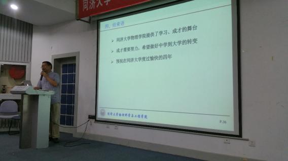 典礼由学院党委副书记考书健主持,副院长羊亚平教授在开学典礼上讲话,他首先对新生们成为同济物理人表示热烈的欢迎与祝贺,并在讲话中回顾了物理学院的发展历史,对新生提出了从中学到大学转变的四点要求,希望新生们能够发现并坚持自己的兴趣,积极开展跨学科、跨专业的学习,成为新世纪的栋梁之才。