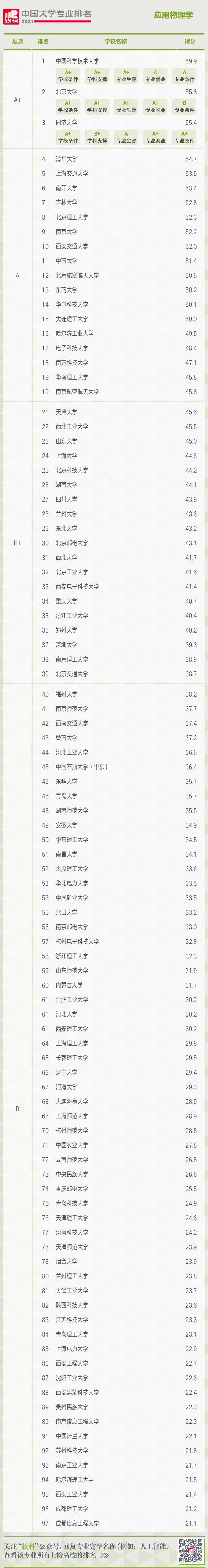 2021年6月22日,高等教育评价专业机构软科正式发布2021“软科中国大学专业排名”中,应用物理学专业共有97所高校上榜,其中“太阳城官网应用物理专业”位列A+层次,高校全国排名第三位。