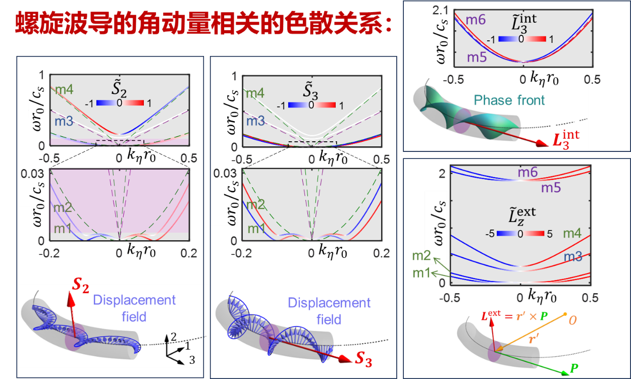 通过分析动力学方程,可以得出六个本征态(如图3所示),这些本征态的频率从低到高依次标记为m1至m6。针对横向自旋S2,在紫色背景标注的频率范围内,色散关系揭示了弹性波的横向自旋存在自旋-动量锁定效应。对于纵向自旋S3,色散图表明m1和m2具有相反方向的自旋,并且它们的相速度也不同,这一特性与光学中的spin-redirection phase相似,且与矢量波的几何相位相关。除了自旋特性外,m5和m6模式还携带方向相反的内在轨道角动量(IOAM),这对应于轨道角动量版本的spin-redirection phase。由于从整体来看,横截面内部的振动影响相对较小,因此主要关注的是波的传播方向和波导的几何结构。基于此,各振动模式的外在轨道角动量(EOAM)性质呈现出相似性。