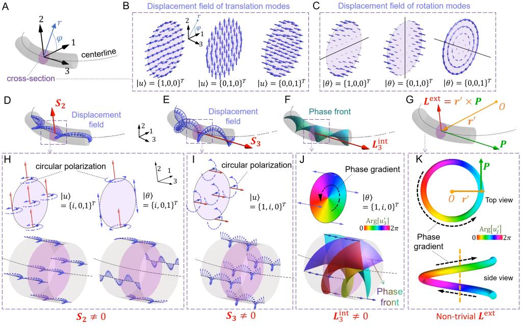 图1:图中红色箭头为角动量方向,蓝色实线箭头为位移矢量,蓝色虚线箭头为位移矢量偏振状态(A)弹性波导简图(B)三个平移自由度对应的横截面位移场振动(C)三个旋转自由度对应的横截面位移场振动(D-E&H-I)弹性波的自旋角动量于位移场的圆极化偏振相关(F&J)弹性波的IOAM与螺旋的等相位波前相关(G&K)弹性波的EOAM与波导的几何结构以及波的传播路径有关