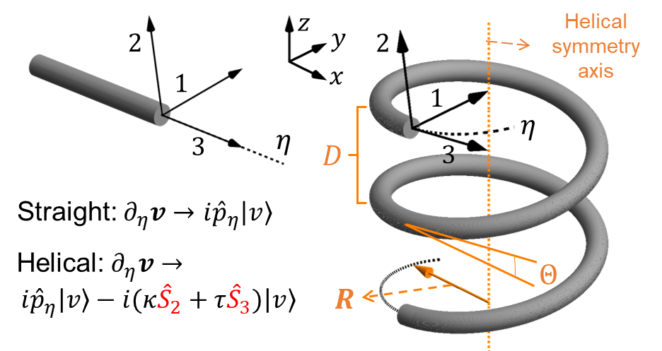 对于直波导来说,空间偏导可以直接写成动量算符的形式,但是弯曲波导会多出与曲率和挠率正比的部分(如图2),代表了结构引起的等效旋转。此等效旋转最终会导致动力学方程中出现导致自旋-轨道相互作用的等效规范势。