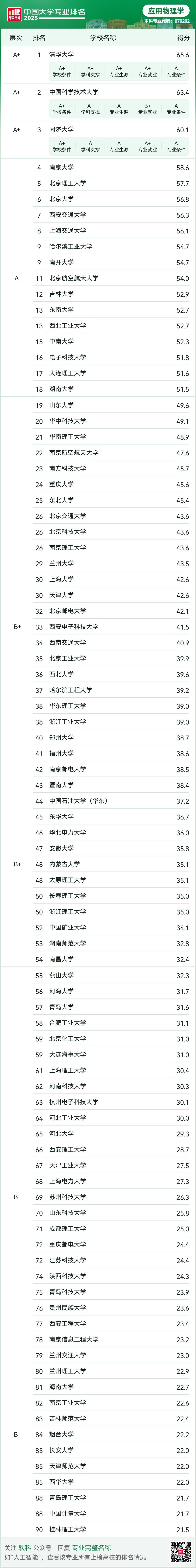 在应用物理学专业排名中,共有90所高校上榜,太阳城官网“应用物理学”专业位列A+层次,高校全国排名第三位。