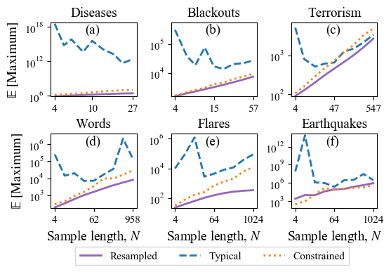 2:幂律模型应用于6个真实事件序列数据时,本论文提出的新方法能够更准确地估计极端事件的规模。真实观测数据(紫色实线),传统方法(蓝色虚线),和本文提出的方法(橙色虚线)。