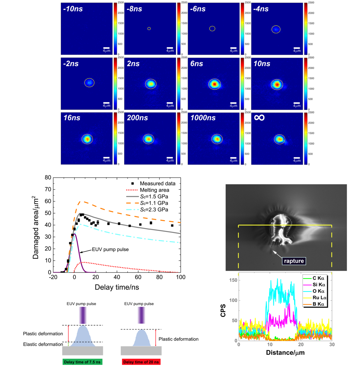 针对上述科学问题,该研究团队以纳秒极紫外光为泵浦光,飞秒光学激光为探测光,在解决了泵浦光的时序控制和杂散光抑制等关键技术难题下,研制成功了高时间和空间分辨的纳秒极紫外泵浦-飞秒红外激光探测成像损伤测试系统(图1),可实现对纳秒极紫外辐照薄膜反射镜的动态损伤形貌开展高时间分辨成像探测。面向我国硬X射线FEL装置(SHINE)FEL-I光束线的应用需求,研究团队设计制备了B4C/Ru双层膜反射镜,并利用上述泵浦-探测系统研究了B4C/Ru双层膜极紫外损伤动力学过程(图2)。泵浦-探测实验表明B4C/Ru双层膜在极紫外光辐照下产生了凸起状损伤,并且在辐照过程中损伤区迅速增加后出现了部分恢复现象。结合温度场和应力场理论模拟与实验测试,发现在EUV辐照下Ru薄膜内部产生的压应力导致双层膜从基板表面脱离并形成凸起状损伤。该研究通过建立热应力损伤物理模型解释了B4C/Ru双层膜损伤区部分自行恢复的现象。