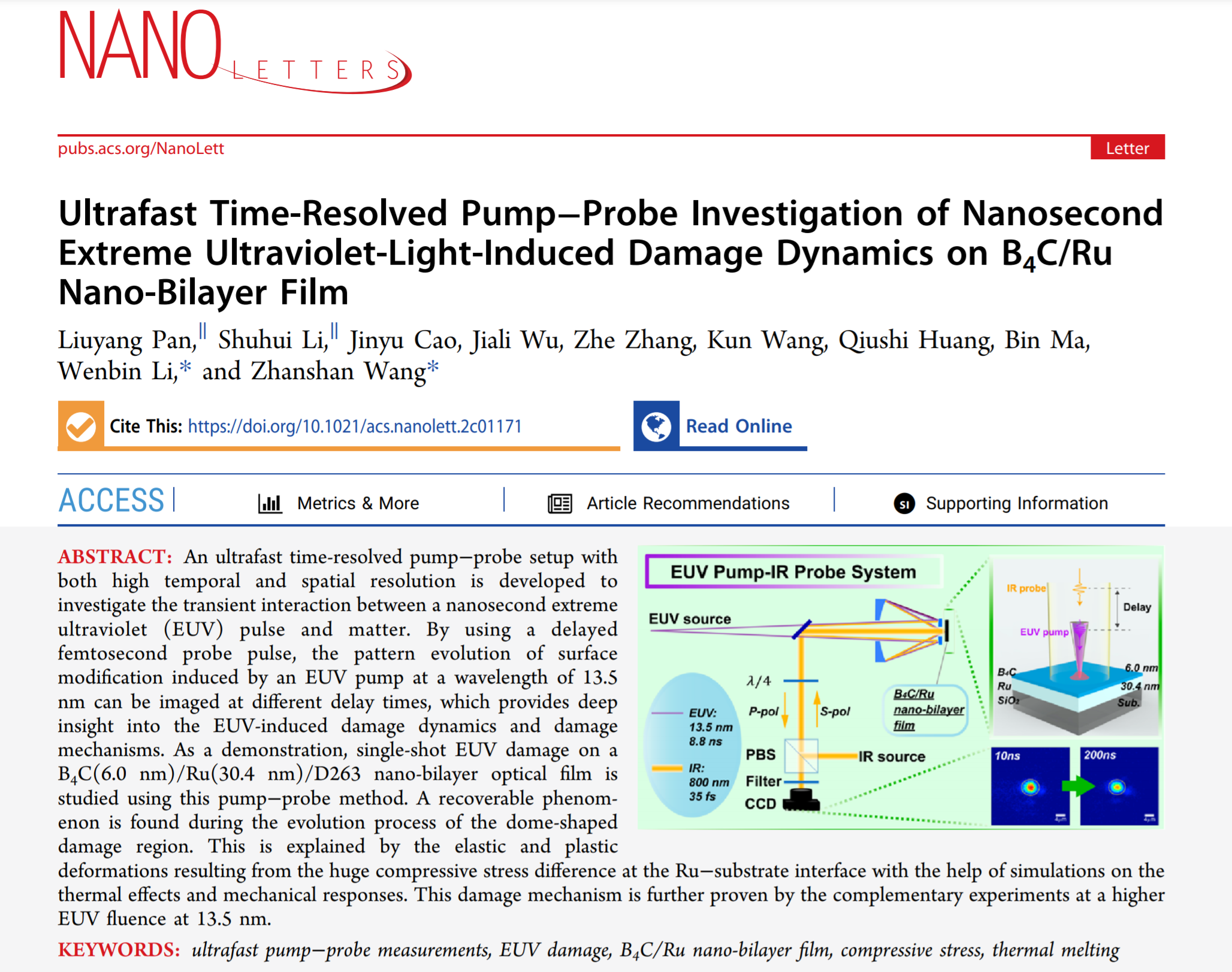 nano-bilayer film)的论文。该论文首次建立了高时间和空间分辨纳秒极紫外泵浦-飞秒红外激光探测成像损伤测试系统,并利用该系统研究了B4C/Ru纳米双层膜反射镜的极紫外损伤动力学过程,揭示了极紫外辐照损伤区存在自我恢复的现象。