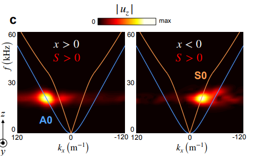 图中理论上A0和S0的色散曲线分别由蓝色和橙色实线标出。当源的振荡频率为20kHz时,我们测到了上图的结果:在源右侧(x>0)主要为A0模式,源左侧(x<0 )主要为s0模式。通常来说,控制两个边界上振动的对称性,需要在每一条边界上都放置一个激励源。但是在兰姆波中,得益于其自旋角动量结构,可以通过a/s模式自旋分布性质的差异,仅在单独一条边界上激励特定的模式。