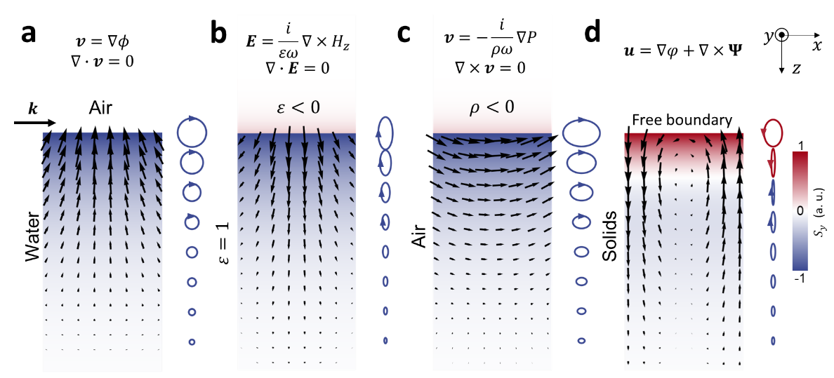 上图中,图a-d分别对应着从左往右传播的表面水波,表面电磁波,表面空气声波和表面弹性波——瑞利波。可以看出,尽管物理体系不同,但是前三者展现出类似的自旋性质,只有弹性表面波的自旋方向相反。这实际上是一个非常简单的数学问题。弹性波的自旋角动量密度可以写为: