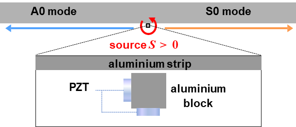 如上图,可以用两个压电片(PZT)组成的自旋源贴在薄板的下表面,并让其激励自旋为正的模式,那么在源的左侧就可以观测到A0模式,在源的右侧观测到S0模式。下图为实验测量结果: