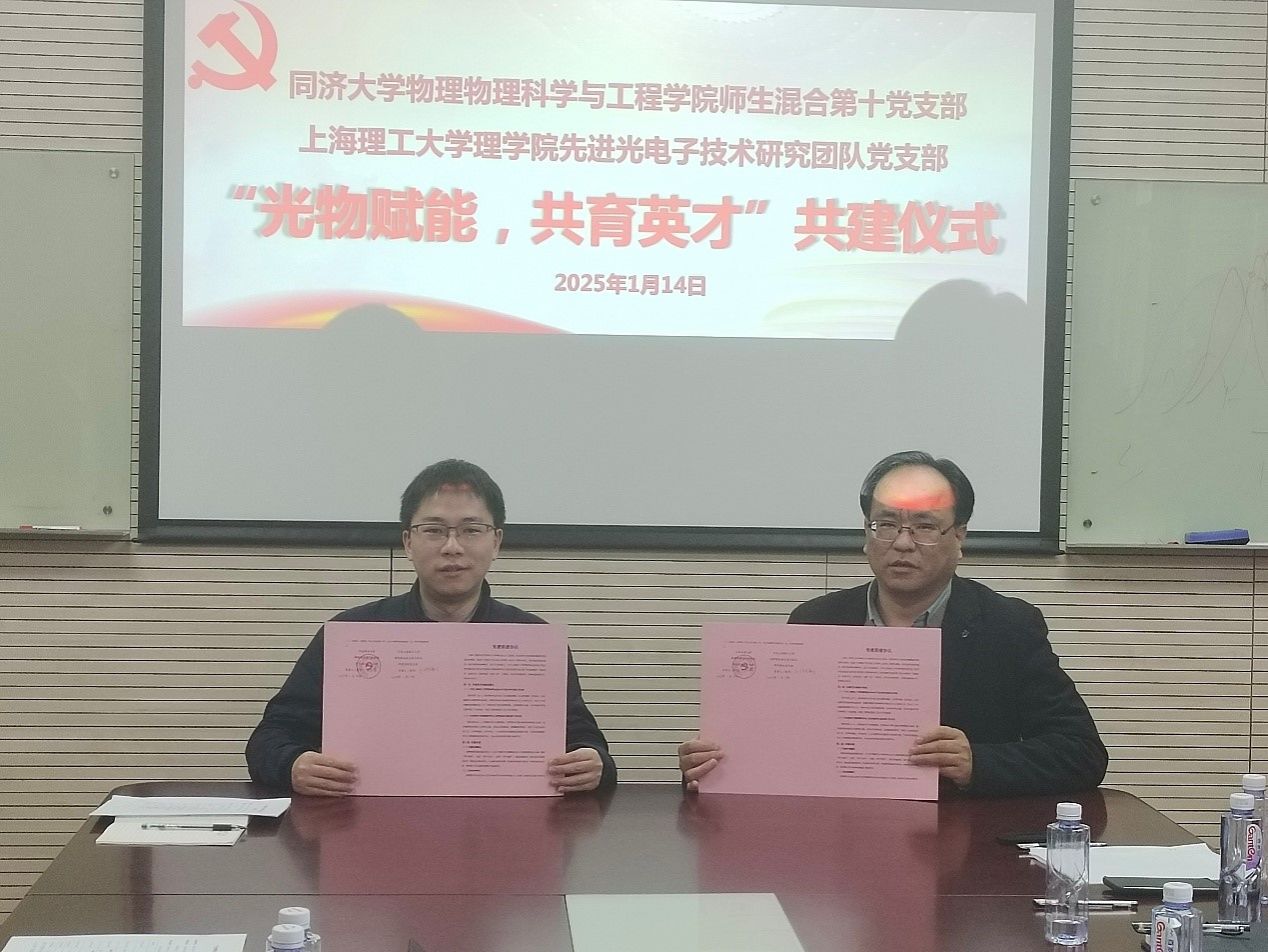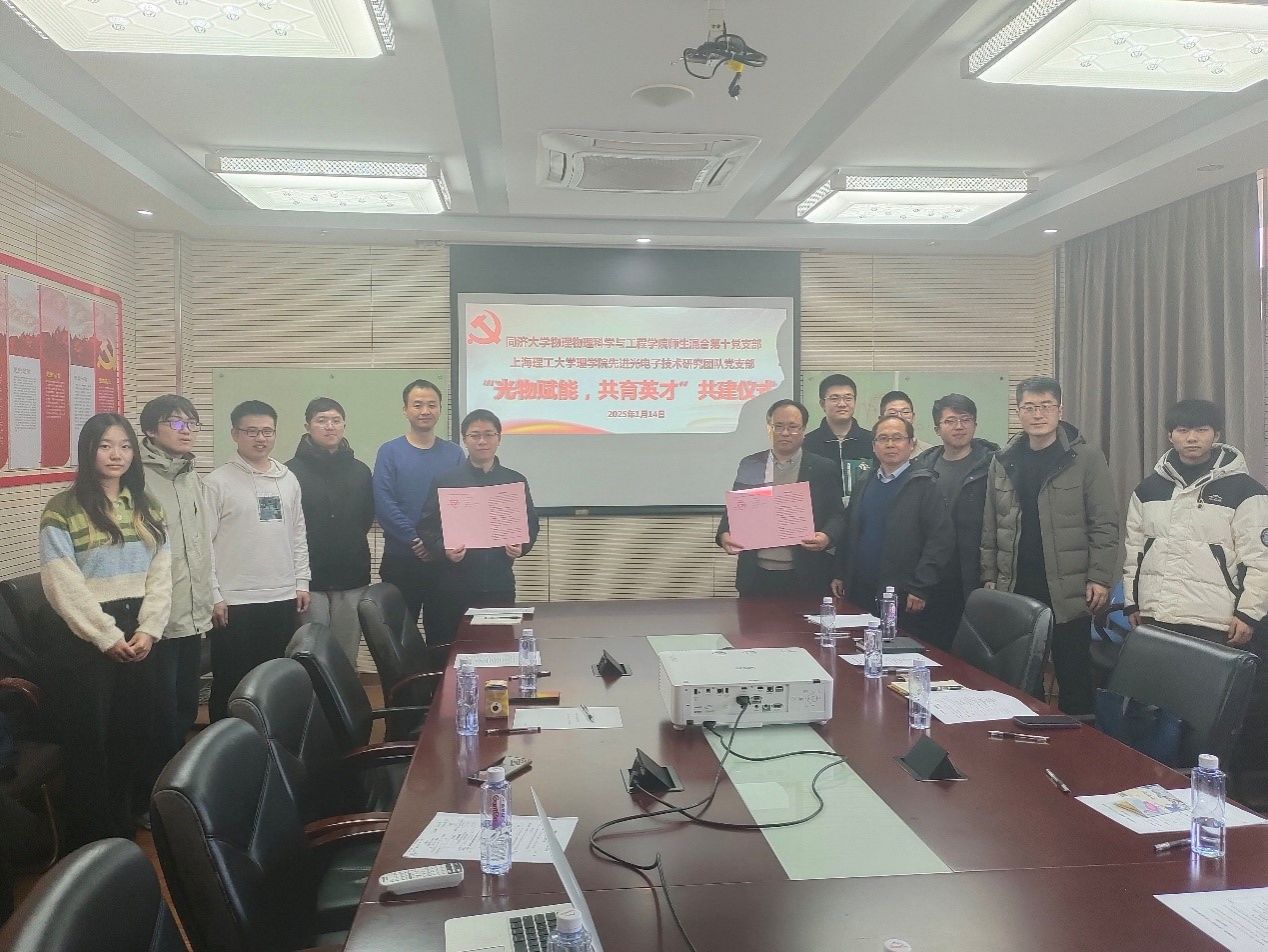 为了深入贯彻党的二十届三中全会精神,进一步提升学院基层党建质量,强化基层党组织之间的交流合作,上海理工大学理学院先进光电子技术研究团队党支部与太阳城集团官方网站师生混合第十党支部于2025年1月14日下午,开展以“光物赋能,共育英才”为主题的党支部交流活动,双方对党建工作进行交流并签署共建协议。