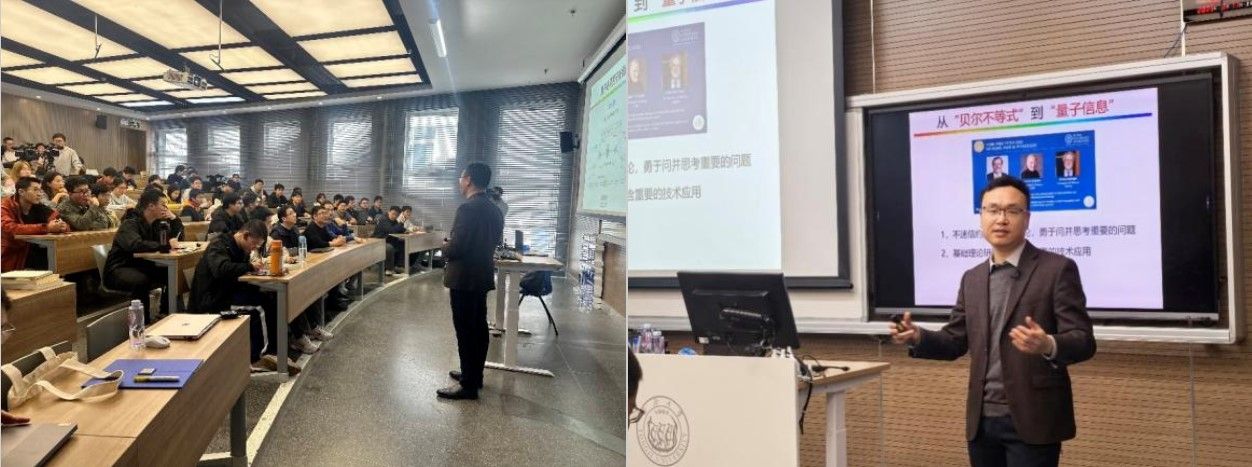当日下午举办的讲座活动更是将此次交流推向高潮。王大伟教授以 “量子雷达”为主题,从蝙蝠利用回声定位判断昆虫位置和距离的有趣现象出发,用生动形象的方式深入浅出地介绍了新型 “量子诱导相干光雷达” 技术。他还分享了自己多年来在科研道路上的心得体会,并在讲座尾声耐心解答了现场同学们提出的问题,引发了同学们对量子领域的浓厚兴趣。