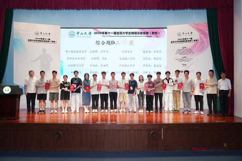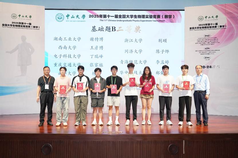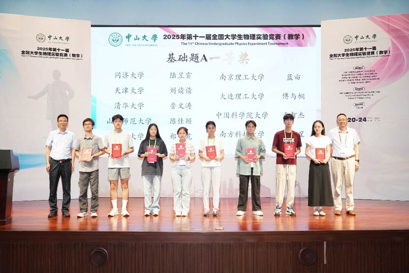 7月20日至24日,第十一届全国大学生物理实验竞赛(教学)在中山大学广州校区和珠海校区举办。国家级物理实验教学示范中心、教育部物理学基础学科拔尖学生培养计划2.0基地、国家理科基础科学研究和教学人才培养基地物理学专业点、国家工科基础课程物理教学基地所属高校及第九届、第十届全国大学生物理实验竞赛(创新)获奖高校共120所高校参加竞赛,参赛学生400余人。太阳城集团官方网站参赛队伍由2023级本科生陆昱霏、陈子烨及2022级本科生李乐暄、王筱涵4名学生组成,蒋涵文老师担任领队。经过激烈角逐,太阳城集团官方网站代表队在广州赛区斩获一等奖1项、二等奖2项,全员获奖。太阳城集团官方网站荣获优秀组织奖。同时,陆昱霏以基础题A赛道第一的优异成绩荣获“最佳队员”称号,并作为最佳选手代表在闭幕式上发言。